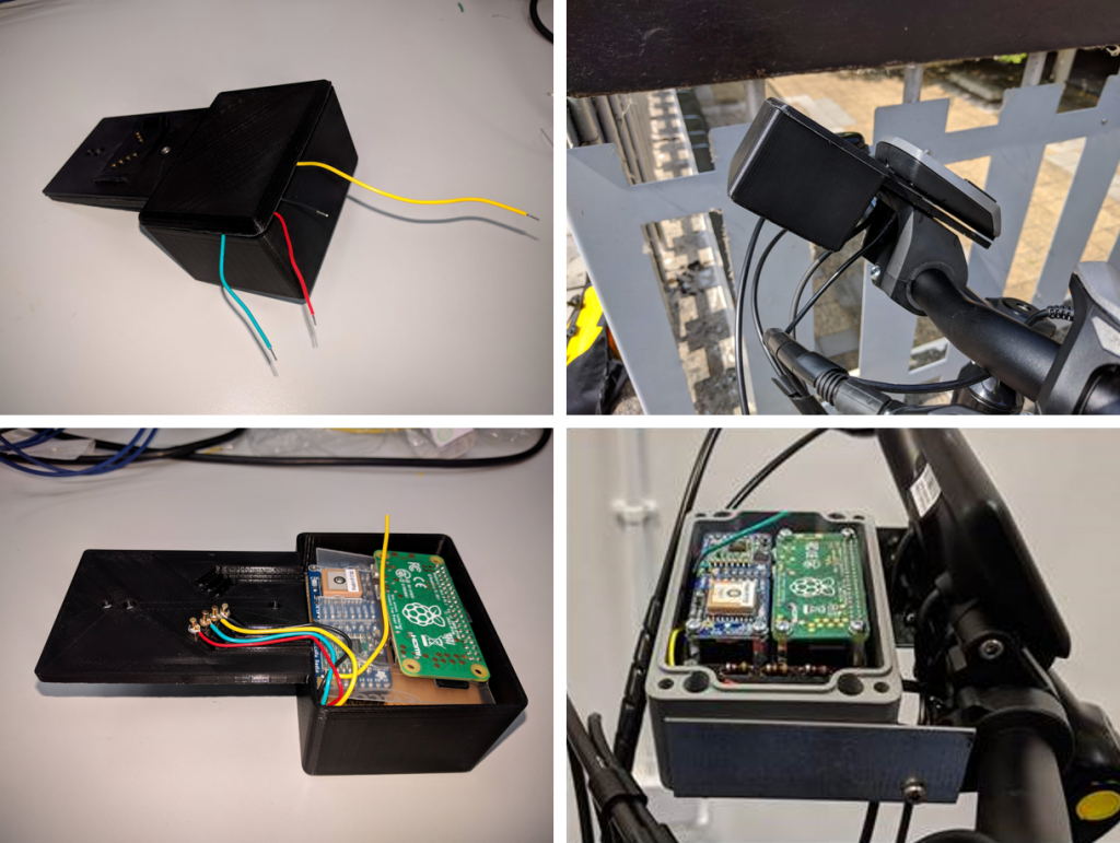 Integrated PCB and enclosure and the complete prototype attached to a bike. Air quality sensor.
